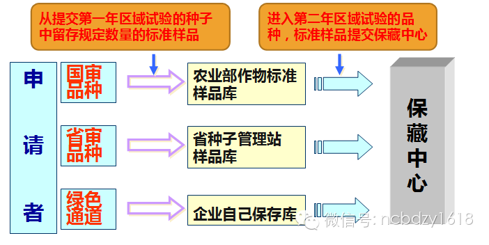 統一品種標準樣品則是,品種審定委員會辦公室在申請者提供的試驗種子中留取標準樣品,交農業部指定機構保存。春播作物每年1月31日前,秋播作物8月31日前提交標準樣品。