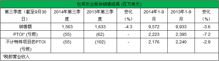2014年第三季度(截至9月30日),杜邦農業板塊(包括作物保護和種子業務)銷(xiao)售(shou)(shou)額(e)下降4.3%,為(wei)(wei)15.63億(yi)美(mei)元(yuan)(yuan)。第三季度(du)PTOI(稅前營業收入)損失5500萬美(mei)元(yuan)(yuan)。2014年1-9月,銷(xiao)售(shou)(shou)額(e)下降3.6%,為(wei)(wei)95.72億(yi)美(mei)元(yuan)(yuan),PTOI下降2.9%,為(wei)(wei)21.76億(yi)美(mei)元(yuan)(yuan)。