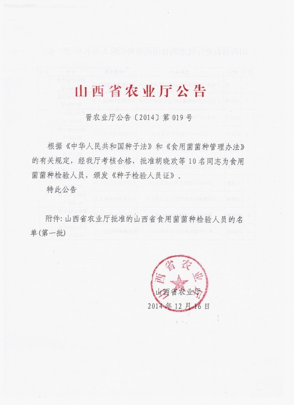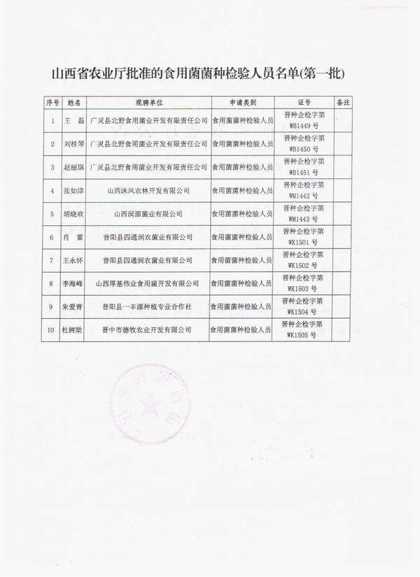 山西省食用菌菌種檢驗人員名單(第一批)