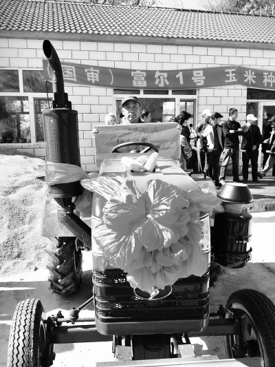 2014年11月9日,黑龍江雙城市臨江鄉民強村,村民姜亞峰站在一大堆玉米堆上,一邊展示他手里的大個玉米棒子,一邊給十里八鄉來觀摩的鄉親們說:“沒想到今年三等地能打一等糧,這個品種就是強!”