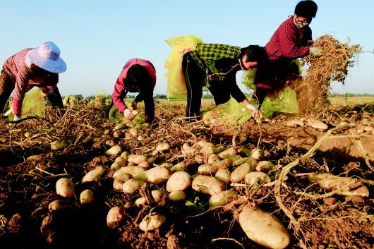 在內蒙古商都(dou),來自山東滕州(zhou)的工(gong)人(ren)正在希森集團(tuan)的種薯大田里收(shou)獲(huo)。 本報記者 郭建(jian)政 攝(she)