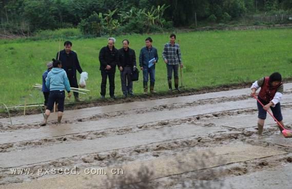 上圖為玉林市農委鄧勇科長和市種子管理站、博白縣種子管理站負責(ze)同(tong)志深入到博白縣東平鎮富門村(cun)水稻示范片(pian)田間指導春播(bo)工(gong)作