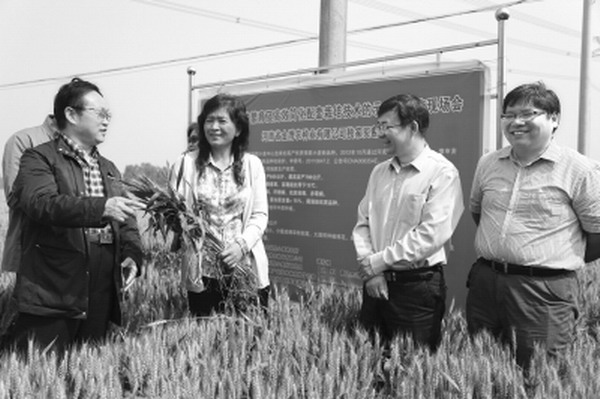 5月16日,優質小麥品種鄭麥583良種繁育及高效簡化配套栽培技術示范與推廣現場會在扶溝縣召開。農業部小麥專家指導組副組長郭天財教授,省政府參事、省科技廳原副廳長王志和等小麥專家及種子經(jing)銷(xiao)商參加了會(hui)議。圖為省農科院小麥(mai)研究所品種利用研究室趙虹主任(左二)正在向王志和(左一(yi))介紹鄭麥(mai)583的(de)特征特性。 小金攝