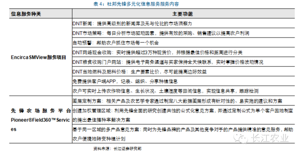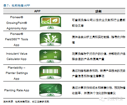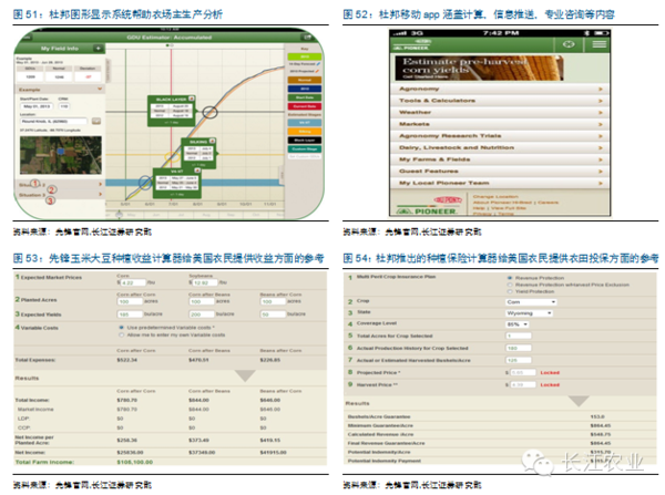 杜邦先鋒完善的產業鏈還體現在無微不至的精細化服務上。杜邦先鋒的精細化服務可謂是貫穿種子的一生,涵蓋種子銷售—播種指導—田間管理指導——收獲指導——作物銷售等。總體上來講,杜邦先鋒在種子的配套服務領域真正做到了精細化和精準化,更貼近農民。其各個環節的具體指導系統包括:(1)先鋒優質種子購銷系統(PioneerPremium SeedTreatment);(2)農戶種植計劃支持系統(Pioneer FIT® Services);(3)ENCLASS® SYSTEM,營銷人員根據每個地區的土壤和氣候狀況幫助農戶選擇合適的種植品種以及田間管理計劃;(3)除草劑、殺蟲劑配套服務支持;(4)技術跟蹤服務,通過先鋒大數據為農戶提供施肥、除草劑、農藥、灌溉等跟蹤建議;(5)農戶網上交易服務平臺(MarketPoint®resource),為農戶提供作物銷售渠道;(6)PSI金融服務公司,杜邦先鋒旗下全資子公司,為客戶制定靈活、方便的支付計劃和其他財務服務。