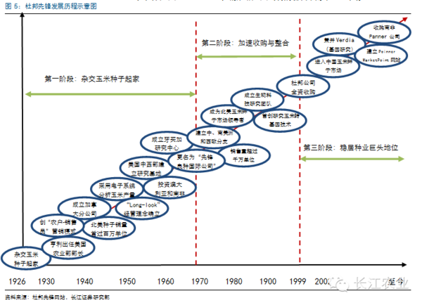 先鋒成立于1926年,1999年被杜邦全資收購,是世界上第二大種子公司,第一大玉米種子生產商。其業務已遍及全球90多個國家和地區。2014年,先鋒種子收入高達76億美元,占杜邦總收入22%。其發展歷程概括為三個階段: