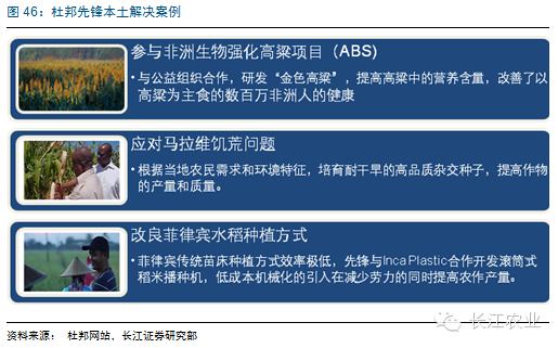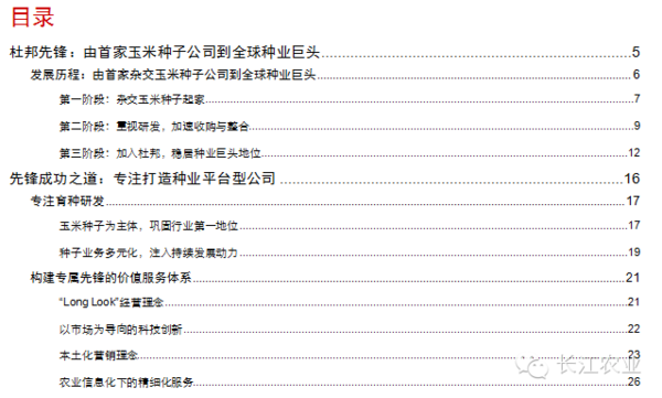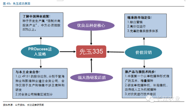 (2)經過激烈的市場競爭和洶涌的并購浪潮,種業中最終留存下的公司大多是實力雄厚的跨國公司。先鋒基于種子產業鏈建立價值服務體系。我們認為,專屬于先鋒的價值服務體系可以理解為:1)“LongLook”經營理念;2)市場為導向的科技創新;3)本土化營銷理念;4)農業信息化下的精細化服務。