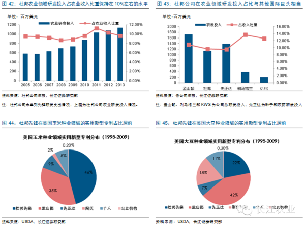 (1)專注育種研發。杜邦先鋒擁有全球60%以上的玉米種質資源,在全球設有110個研發中心,覆蓋25個國家,并擁有4000多名研究人員,每年投入的研發收入占銷售收入的比重均超過10%。公司每年可篩選約300種新的自交系種子, 測試800余種新的試驗性雜交種子,并利用最先進的計算機網絡在最短的時間內培育出具有市場前景的種子。