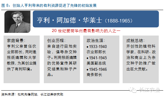 亨利的家庭背景為其創建種子公司提供了非常有利的環境。其祖父不僅是愛荷華州的大農場主,同時參與創建了“農民保護協會”、“農業編輯聯盟”等協會,其父親曾擔任報紙編輯、大學教授和并出版多本書籍。1921,由于亨利的父親出任美國農業部部長,亨利接管家族經營的 “Wallace’s Farmer”(當時主要農業報紙)。亨利憑借有利的資源優勢,利用報紙大力宣傳其研究和種子產品,郵售玉米種子。另外,亨利自身對種子研究具有極大興趣,不僅對傳統種子提出了挑戰,同時親自進行田地實驗,是早期倡導雜交玉米種子的研究者之一。
