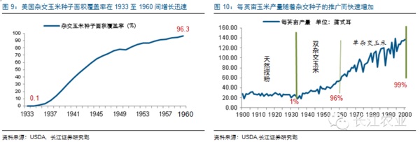 雜交玉米種子在美國的普遍采用,離不開美國農業部的支持和大力推廣。1933年,美國采用新型雜交玉米種子的面積覆蓋率僅為0.1%。30年代末,雜交種子覆蓋了美國中部玉米帶大約一半的土地。截止至1960年,全國雜交玉米種子覆蓋率則高達96.3%。1933年,先鋒創始人亨利當選美國農業部部長,在其任職期間,全力宣傳和推廣雜交種子,而作為主要產品為雜交玉米的先鋒良種,則對此予以了積極響應。由于玉米是美國的最主要的糧食作物,雜交玉米種子推廣也促進了美國種業革新。