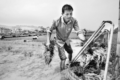 圖為合作(zuo)社農民把經過殺菌消毒后的秧苗(miao)挑到田里栽(zai)植。 楊(yang)俊文/圖