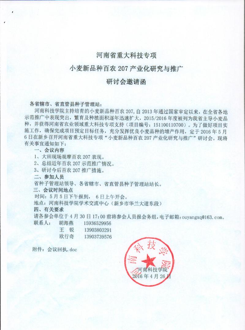 小麥新品種百農207產業化研究與推廣研討邀請函