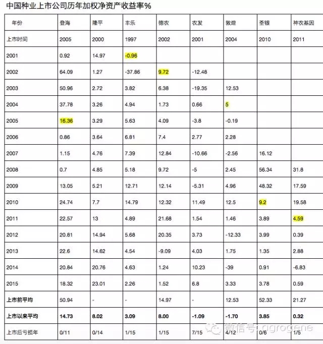第一(yi),種(zhong)(zhong)(zhong)(zhong)(zhong)業(ye)(ye)(ye)上(shang)市公司(si)凈(jing)資(zi)產收(shou)(shou)(shou)益率(lv)不(bu)高。從(cong)各公司(si)上(shang)市至(zhi)2015年(nian)的(de)(de)(de)(de)平(ping)均(jun)加(jia)權(quan)凈(jing)資(zi)產收(shou)(shou)(shou)益率(lv)來看,除登海種(zhong)(zhong)(zhong)(zhong)(zhong)業(ye)(ye)(ye)接近15%外,其余7家均(jun)低于10%,其中隆平(ping)高科(ke)、萬向德農均(jun)約(yue)8%,豐樂種(zhong)(zhong)(zhong)(zhong)(zhong)業(ye)(ye)(ye)、荃(quan)銀(yin)高科(ke)為(wei)3%-4%,神農基因為(wei)0.3%,農發(fa)種(zhong)(zhong)(zhong)(zhong)(zhong)業(ye)(ye)(ye)、敦煌種(zhong)(zhong)(zhong)(zhong)(zhong)業(ye)(ye)(ye)均(jun)為(wei)負值,分別為(wei)-1.09%和-1.7%。還(huan)有一(yi)點需(xu)要說明的(de)(de)(de)(de)是,種(zhong)(zhong)(zhong)(zhong)(zhong)子行(xing)業(ye)(ye)(ye)是零稅(shui)負,沒有營業(ye)(ye)(ye)稅(shui),沒有增值稅(shui),沒有企業(ye)(ye)(ye)所得稅(shui)(可全額減免),此(ci)(ci)外各級政府還(huan)有大量的(de)(de)(de)(de)無償項目資(zi)金支(zhi)持!在這樣的(de)(de)(de)(de)情況(kuang)下(xia),8家公司(si)中仍有5家的(de)(de)(de)(de)歷年(nian)加(jia)權(quan)凈(jing)資(zi)產收(shou)(shou)(shou)益率(lv)低于4%,僅(jin)相(xiang)當于同期(qi)銀(yin)行(xing)一(yi)年(nian)期(qi)定(ding)期(qi)存(cun)款的(de)(de)(de)(de)收(shou)(shou)(shou)益!多(duo)數(shu)種(zhong)(zhong)(zhong)(zhong)(zhong)業(ye)(ye)(ye)公司(si)加(jia)權(quan)凈(jing)資(zi)產收(shou)(shou)(shou)益率(lv)長期(qi)不(bu)高,這只能(neng)說明種(zhong)(zhong)(zhong)(zhong)(zhong)子行(xing)業(ye)(ye)(ye)不(bu)掙(zheng)錢。此(ci)(ci)外,也似(si)乎說明種(zhong)(zhong)(zhong)(zhong)(zhong)子行(xing)業(ye)(ye)(ye)也符合“二八定(ding)律”,優質公司(si)是少(shao)數(shu)。