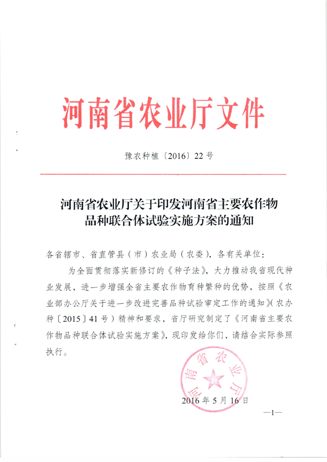 河南省主要農作物品種聯合體試驗實施方案