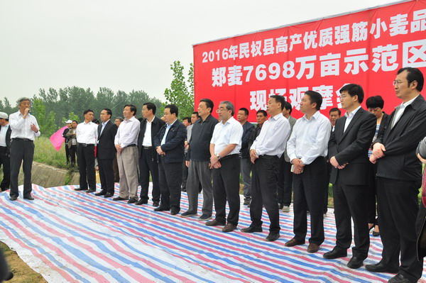 5月14日,我院在商丘民權縣組織召開高產優質強筋小麥新品種鄭麥7698萬畝示范區現場觀摩會,院長張新友、黨委書記霍好勝、副院長鄒慶鵬,省農業廳副廳長魏蒙關和商丘市副市長張家明等領導和專家以及相關企業代表出席會議。