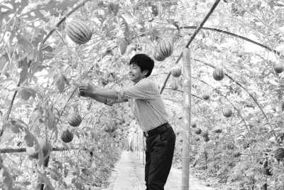 近日,在浙江省建德市航頭鎮航景村瓜菜新品種展示中心種植基地,管理技術人員余志軍欣喜地查看在空中生長的西瓜、番茄的生長情況。