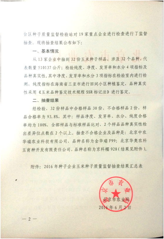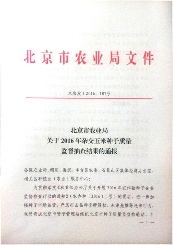 北京市2016年雜交玉米種子質量監督抽查結果通報