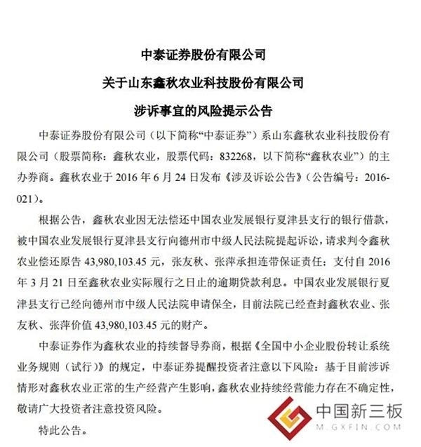 特別值得注意的是,在董事長連續減持后,這家公司還惹上了官司。鑫秋農業在2016年6月24日發布公告稱“因無法償還中國農業銀行的銀行借款,被提起訴訟并判令償還43980103.45元,張友秋、張萍承擔連帶責任。”