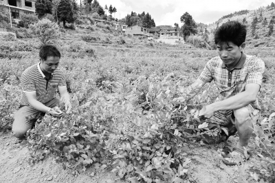 幾天前,湖南省隆回縣小沙江鎮農業綜合服務站干部王愛斌(左)在基地察看藍莓的成熟情況。今年,小沙江鎮響龍村委會主任胡焱青引進品種,利用高海拔氣候試種藍莓5畝多,并帶動村民散種獲得成功。他們的藍莓果肉細膩,甜酸適口,香氣宜人,且營養價值高,市場售價每公斤200多元。 賀上升攝