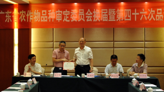 2016年7月27日,廣東省農作物品種審定委員會換屆暨第四十六次品種審定會議在珠海召開。省農業廳副廳長、省農作物品種審定委員會主任黃斌民出席會議并講話。省農業廳總農藝師、農作物品種審定委員會副主任陸國煌宣讀了廣東省農業廳《關于印發廣東省第九屆農作物品種審定委員會組成人員名單的通知》,黃斌民副廳長代表省農業廳向委員代表頒發了聘書。