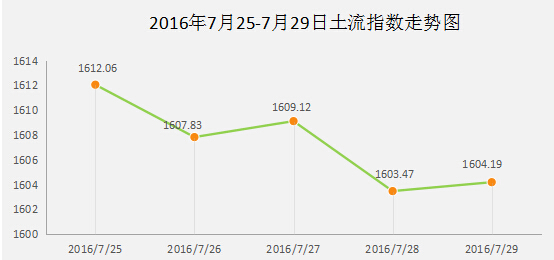 本(ben)周 “土流(liu)網(wang)·土地流(liu)轉(zhuan)指(zhi)數”表現(xian)為:多重因素導(dao)致土流(liu)指(zhi)數下降,從2016年7月25日的(de)1612.06到2016年7月29日1604.19, 降幅較小。