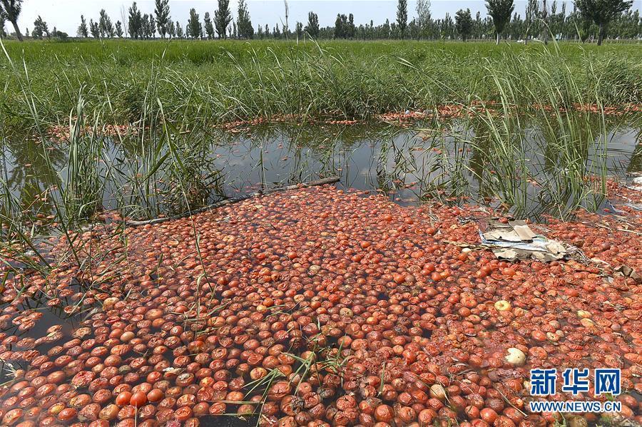 在寧夏靈武市梧桐樹鄉陶家圈村,田邊的溝渠內密布著農戶因為滯銷而傾倒丟棄的西紅柿(8月2日攝)。