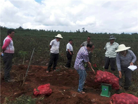 當前祿勸縣馬鈴薯中低海拔種植區開始采收,為檢驗2016年馬鈴薯種薯更新換代工作成效,為全縣脫貧摘帽計算收支明細賬提供有力支撐,根據縣農業局安排部署,2016年7月28日,祿勸縣農技總站組織技術人員到九龍鎮教務營村委會對更新換代種薯“青薯9號”進行第一次田間現場測產。技術人員嚴格按照測產規范要求,分別選取農戶自留種“合作88”種植區、更新換代種薯“青薯9號”種植區進行測產對比,產量最高一戶的同田測產換種“青薯9號”的畝產為3727千克,農戶自留種“合作88”的畝產為2230千克,“青薯9號”畝增產1497千克,增產幅度為67.13%,根據技術人員對每個品種隨機選取3個點測產實收測算,農戶自留種種植區合作88田間多點平均畝產量為1775千克,更新換代種植區“青薯9號”田間多點測驗平均畝產量為2967千克,比農戶自留種種植區“合作88”增產1192千克,按平均每千克單價1.2元計算,每畝可實現產值增加1430.4元。