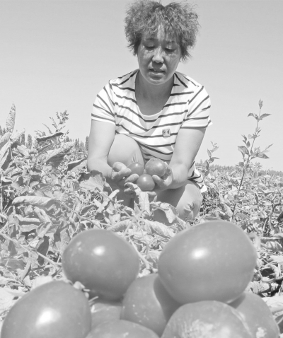 8月10日,新疆生產建設兵團第八師一四三團十三連女職工李士蘭正在采摘豐收的番茄,拉開了該團萬畝制醬番茄采收的帷幕。該團今年訂單種植的1萬畝制醬番茄,由于采用移栽苗和膜下節水滴灌先進技術,萬畝制醬番茄喜獲豐收,單產8噸左右,總產約8萬噸。 王仁斯攝