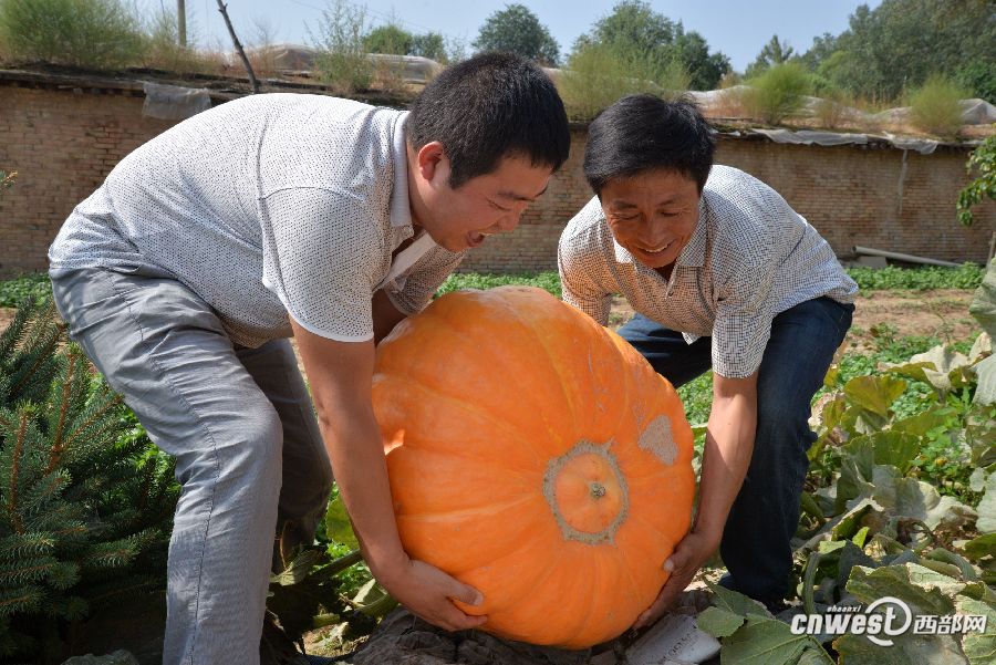 西部網訊(通訊員 白凌燕 劉河)近日,筆者聽說張伙場村長出一只一百多斤的大南瓜。8月12日,筆者慕名來到靖邊縣張家畔街道辦的張伙場村,一探究竟。在靖邊縣樂豐家庭農場主云玉虎家的院門外筆者看到了這顆大南瓜,大南瓜除了個頭大,長相和其他南瓜并沒有差異,滿身金黃,瓜蒂有小孩拳頭般大小,小孩子可以坐在上面玩。一個大人抱不動,兩人很勉強,三人才能穩當,這就是有22年種菜經驗的云玉虎培育出來的130斤的巨大南瓜。
