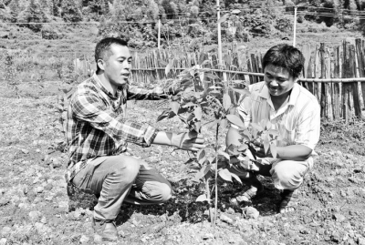 8月17日,湖南省隆回縣小沙江鎮農業綜合服務站站長康永宏(左)在該鎮黃灣村指導村民李榮兵對甜茶葉進行栽培管理。