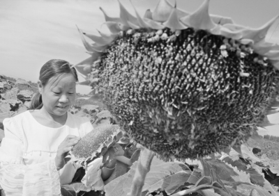 8月18日,新疆生產建設兵團第八師一四三團十連女工楊溢燕正在查看油葵成熟情況。楊溢燕今年引種的50畝美國矮大頭油葵新品,由于采用地膜覆蓋、精量播種、節水滴灌等一系列先進技術,油葵喜獲豐收,畝產在250公斤以上。該品種的特點是:個頭矮、頭大、產量高,出油率高達40%以上。 王仁斯攝