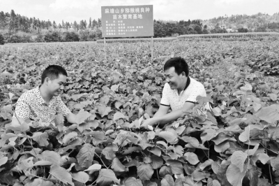 8月19日,湖南省隆回縣麻塘山鄉橫排村大學生周建國(左)與該鄉農業綜合服務站站長楊思源在獼猴桃苗圃基地察看苗木長勢和交流栽培管理技術。周建國2010年大學畢業后,回鄉自主創業栽培了200多畝優質獼猴桃,嫁接培育了翠玉、東紅、金艷、黃金果、翠香等6個獼候桃系列優良品種,苗木通過網絡平臺銷往全國各地。 賀上升攝