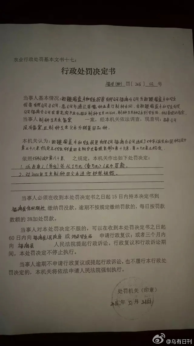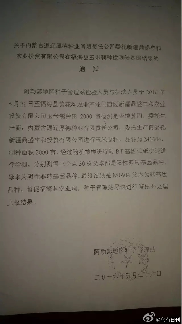 新疆鼎盛豐和農業投資有限公司福海分公司為新疆鼎盛豐和農業投資有限公司子公司,總公司與通遼厚德種業簽訂制種合同,由新疆鼎盛豐和農業有限公司福海分公司在黃花溝產業化園區制種玉米M1604,制種玉米種子未到農業局、種子管理站備案。經本機關依法調查,現查明當事公司沒有備案,且制種玉米父本為轉基因品種。“新疆鼎成豐和農業投資有限公司福海分公司違反了中華人民共和國種子法第三十八條規定,以及農業轉基因生物安全管理條例第十九條,第二十三條規定。”