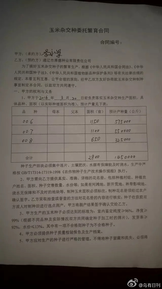 【轉基因觀察(微信號:zhuanjiy)】從雙方簽訂的合同上看到:甲方(李永軍)于3月20日前負責落實玉米雜交種生產面積,其中006號面積1150畝,預計產種量575000公斤,007號面積1100畝,預計產種量子力55000,008面積650畝,預計產種量子力325000公斤。合計2900畝,1450000公斤。