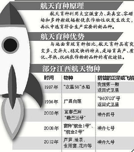2012年6月29日上午10時03分,伴隨“神舟九號”載人飛船返回艙順利著陸,省農科院代表中國南方航天育種技術研究中心搭載的蘆筍、油茶、食用菌、花卉等農作物種子也隨之成功返回,再一次壯大了我省航天物種的“陣容”。據統計,截至目前,已有60多種江西特色作物100多個品種飛入太空。