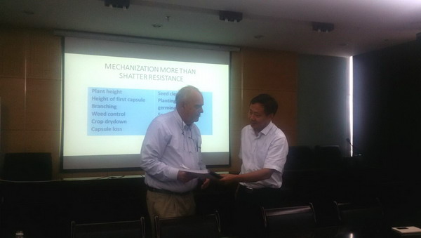 9月19—23日,美國著名芝麻育種家Ray Langham先生來河南省農科院訪問交流。Langham先生作了題為“SESAME MECHANIZATION: A family’s life journey”的學術報告,并就世界芝麻種質創新、育種技術、抗裂蒴品種選育以及機械化生產發展歷程等熱點問題與我院以及來自安徽、江西等省芝麻育種家們進行了深入的座談交流。訪問期間,Langham先生還實地考察了我院芝麻研究中心原陽試驗基地、周口芝麻綜合試驗站和周口芝麻良種繁育與加工示范基地。