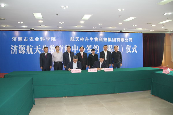 9月30日,濟源市農科院與航天神州生物科技集團有限公司在行政區會議中心舉行濟源航天生物育種中心簽約(揭牌)儀式。中國空間技術研究院航天生物集團總工程師趙輝、航天工程育種研究室主任鹿金穎,濟源市市委常委、副市長孔慶賀,濟源市農科院院長尹國紅、副院長張慶社、成東梅出席簽約儀式。