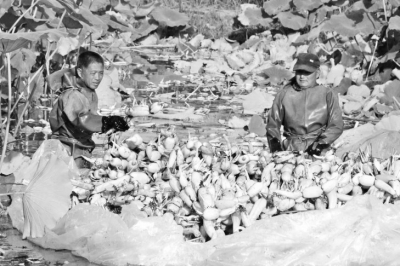 10月11日,山東省濱州高新區青田街道辦事處軍帥蓮藕合作社農民在收獲蓮藕。