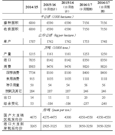 在實施目標價格補貼、結構調整引導等一系列政策和市場機制的作用下,我國大豆比較收益回升,生產出現恢復性增長。2016/17年度我國大豆收獲面積預計比上年度擴大840萬畝、增長8.5%,恢復至1億畝以上,扭轉了持續多年萎縮的局面。因前期旱情和9月多雨寡照,本月平衡表調減了2016/17年度大豆單產和產量。但是,新年度大豆產量預計將達1250萬噸,相較于上年度提高了89萬噸,增幅7.7%。全球大豆供應寬(kuan)松,進(jin)口大(da)豆價(jia)格持(chi)(chi)續(xu)(xu)低(di)迷(mi)。由于大(da)豆壓榨消費需(xu)求持(chi)(chi)續(xu)(xu)增長,產需(xu)缺口繼(ji)續(xu)(xu)擴大(da),新年度進(jin)口量預計8350萬噸,將創歷史新高(gao)。振興(xing)東北大(da)豆、提高(gao)國產大(da)豆自給率,還需(xu)要在(zai)改(gai)良品(pin)種(zhong)、改(gai)善品(pin)質和降低(di)成本、提高(gao)競爭力上下(xia)功(gong)夫。