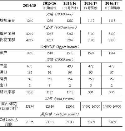 我(wo)(wo)國(guo)棉(mian)花(hua)(hua)面積(ji)與(yu)(yu)產量(liang)(liang)持續(xu)下(xia)(xia)調(diao)(diao),結構調(diao)(diao)整與(yu)(yu)去(qu)庫存的(de)(de)效果突出。2015/16年(nian)度(du)(du)棉(mian)花(hua)(hua)收獲(huo)面積(ji)估(gu)計為4.9億(yi)畝(mu)(mu)、比上(shang)年(nian)度(du)(du)降(jiang)3.9%;產量(liang)(liang)估(gu)計為493萬(wan)噸(dun)(dun)、比上(shang)年(nian)度(du)(du)減(jian)123萬(wan)噸(dun)(dun),降(jiang)幅達20%。盡管(guan)本月(yue)上(shang)調(diao)(diao)了棉(mian)花(hua)(hua)單產,但面積(ji)、產量(liang)(liang)雙(shuang)降(jiang)的(de)(de)趨勢延續(xu)至(zhi)2016/17年(nian)度(du)(du)。預(yu)計棉(mian)花(hua)(hua)播(bo)種面積(ji)下(xia)(xia)降(jiang)至(zhi)4.65億(yi)畝(mu)(mu),比上(shang)年(nian)度(du)(du)減(jian)2500萬(wan)畝(mu)(mu);產量(liang)(liang)478萬(wan)噸(dun)(dun),比上(shang)年(nian)度(du)(du)減(jian)15萬(wan)噸(dun)(dun)。從平(ping)衡表可見,自2014年(nian)實施(shi)棉(mian)花(hua)(hua)目標價格補貼以(yi)來,棉(mian)花(hua)(hua)產量(liang)(liang)、進口量(liang)(liang)大幅下(xia)(xia)降(jiang),庫存量(liang)(liang)快速降(jiang)低。2015/16年(nian)度(du)(du)儲備(bei)(bei)棉(mian)投(tou)放成交量(liang)(liang)超過(guo)200萬(wan)噸(dun)(dun),期末庫存降(jiang)至(zhi)1113萬(wan)噸(dun)(dun),2016/17年(nian)度(du)(du)將(jiang)降(jiang)至(zhi)935萬(wan)噸(dun)(dun)。按每年(nian)170-180萬(wan)噸(dun)(dun)的(de)(de)去(qu)庫存速度(du)(du)計,兩個市場(chang)年(nian)度(du)(du)后我(wo)(wo)國(guo)儲備(bei)(bei)棉(mian)庫存消(xiao)費比將(jiang)回到合理水平(ping),未來棉(mian)花(hua)(hua)生產結構調(diao)(diao)整將(jiang)維(wei)持溫和態(tai)勢。