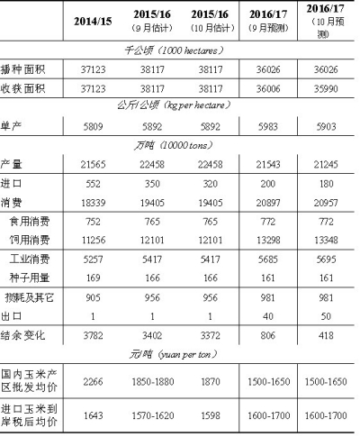 玉(yu)米(mi)面積(ji)與產(chan)(chan)(chan)量(liang)(liang)繼續(xu)下(xia)調,結構調整取得預(yu)期(qi)(qi)成效,產(chan)(chan)(chan)消(xiao)關系(xi)表(biao)現(xian)出趨(qu)(qu)于平(ping)衡格局的(de)(de)樂觀(guan)前景。受前期(qi)(qi)干旱和(he)月(yue)內極端天(tian)氣引的(de)(de)影(ying)(ying)響,本(ben)月(yue)平(ping)衡表(biao)調減(jian)(jian)了2016/17年度玉(yu)米(mi)收(shou)獲面積(ji)和(he)產(chan)(chan)(chan)量(liang)(liang)的(de)(de)預(yu)測(ce)值,面積(ji)比(bi)上(shang)年度調減(jian)(jian)3190萬(wan)畝、降5.6%,2003年以來玉(yu)米(mi)面積(ji)持續(xu)擴張(zhang)的(de)(de)趨(qu)(qu)勢(shi)首次逆(ni)轉(zhuan);產(chan)(chan)(chan)量(liang)(liang)預(yu)計2.1245億(yi)噸,比(bi)上(shang)月(yue)下(xia)調298萬(wan)噸,比(bi)上(shang)年度減(jian)(jian)1213萬(wan)噸、降幅5.4%。受玉(yu)米(mi)及其替代品進口減(jian)(jian)少(shao)、出口退稅政(zheng)策利好和(he)飼用(yong)擴大、深加工恢復的(de)(de)影(ying)(ying)響,玉(yu)米(mi)飼用(yong)消(xiao)費、工業消(xiao)費需求呈增(zeng)長態勢(shi)。新年度國內玉(yu)米(mi)消(xiao)費量(liang)(liang)預(yu)計為(wei)2.0957億(yi)噸,期(qi)(qi)末結余增(zeng)量(liang)(liang)比(bi)上(shang)月(yue)調減(jian)(jian)388萬(wan)噸,比(bi)上(shang)年度減(jian)(jian)少(shao)近(jin)(jin)3000萬(wan)噸,年度產(chan)(chan)(chan)消(xiao)盈(ying)余下(xia)降至(zhi)288萬(wan)噸,接(jie)近(jin)(jin)于產(chan)(chan)(chan)消(xiao)平(ping)衡的(de)(de)合理區間(jian)。隨著9月(yue)國內新玉(yu)米(mi)進入“上(shang)市(shi)季”,華北局部地(di)區玉(yu)米(mi)價格繼續(xu)回(hui)落,