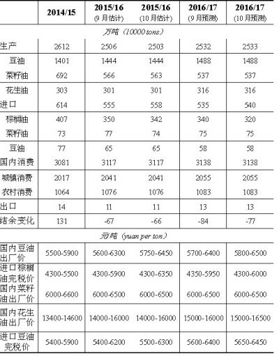 食用植物油消費需求保持持續穩定增長態勢。我國食用植物油消費量每年增加約20-30萬噸,預計2016/17年度消費量為3138萬噸。受國際市場棕櫚油價格上漲和國內臨儲菜籽油出庫消化的影響,本月調低了棕櫚油、菜籽油進口量,食用植物油進口量總體平穩。新年度我國植物油生產呈擴大趨勢,華北地區花生種植面積(ji)有所增長(chang),花生(sheng)(sheng)油(you)(you)產(chan)量(liang)預(yu)計比上(shang)年(nian)度(du)(du)提高15萬(wan)噸(dun);食(shi)用植物油(you)(you)產(chan)量(liang)2533萬(wan)噸(dun),比上(shang)月調(diao)增1萬(wan)噸(dun)、比上(shang)年(nian)度(du)(du)提高30萬(wan)噸(dun)。我國食(shi)用植物油(you)(you)產(chan)消缺(que)口在600萬(wan)噸(dun)左(zuo)右(you),如(ru)果計入進(jin)口大豆,自給率僅1/3。從中長(chang)期看,降低生(sheng)(sheng)產(chan)成本、促進(jin)油(you)(you)料作(zuo)物發展,依然(ran)是(shi)農業供給側結(jie)構性(xing)改革的(de)重要任務。