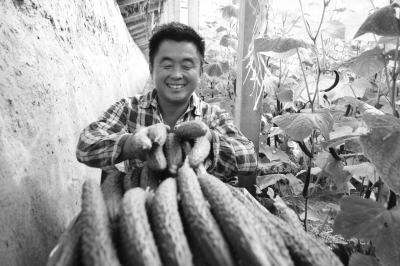 試種成功。該品種黃瓜果肉淡綠色、質脆、味甜、品質佳,暢銷京津冀。圖為菜農王春強在整理黃瓜準備上市。 張波武曉攝