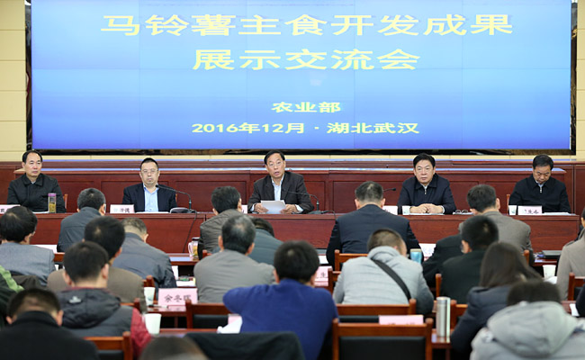 12月15日,農業部在湖北省武漢市召開馬鈴薯主食開發成果展示交流會。中國農業科學院黨組書記陳萌山、農業部總農藝師孫中華出席會議并講話。會議強調,要以新的發展理念為引領,強化創新驅動,聚焦重點發力,扎實推進馬鈴薯主食開發,將“小土豆”打造成“大產業”,引領城鄉居民健康消費,助力農業供給側結構性改革。
