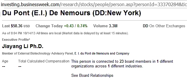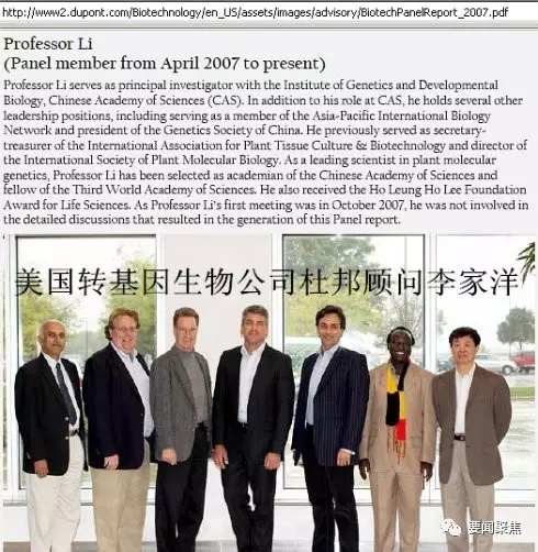 然而,上述杜邦公司自己網站公布的消息并未獲得證實。據“直言了”查證,直至2013年10月14日,美國股市的報告仍然清楚地說明:自2007年至今,中國農業部副部長兼中國農科院院長(前中科院副院長)李家洋一直都是美國轉基因種子公司杜邦公司的顧問: