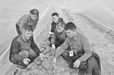 2月28日,安徽省宿州市埇橋區曹村鎮農技人員在種瓜大戶張大賀(左)大棚內觀測“玉姑”新品種瓜生長情況。張大賀夫妻在上海郊區打工13年,主要租地種植良種
