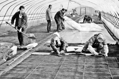 缽育毯式超早育苗的各項準備工作。據悉,這個分公司今年示范種植“稻花香二號”優質水稻品種500畝,采取缽育毯式超早育苗技術可實現早育苗、早插秧、搶積溫,促進水稻增產豐收。圖為工人在進行擺盤作業和鋪設保溫膜。 劉江攝