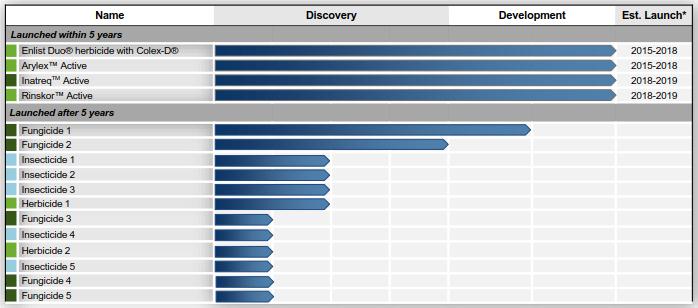 陶氏預測Enlist™大豆的市場面積可達5000萬英畝,Enlist™玉米市場約4000萬英畝,Enlist™棉花市場為1000萬英畝。陶氏預計另一個強勁產品PowerCore™玉米的市場面積將會達到1億英畝,該產品可有效防治地上廣譜害蟲。預計在2018-2021年在美國和加拿大推出的SmartStax®PRO玉米是第一種針對地下害蟲的具有三種作用模式的產品,抗蟲效果良好,陶氏預測SmartStax®PRO玉米的市場面積可達1億英畝。