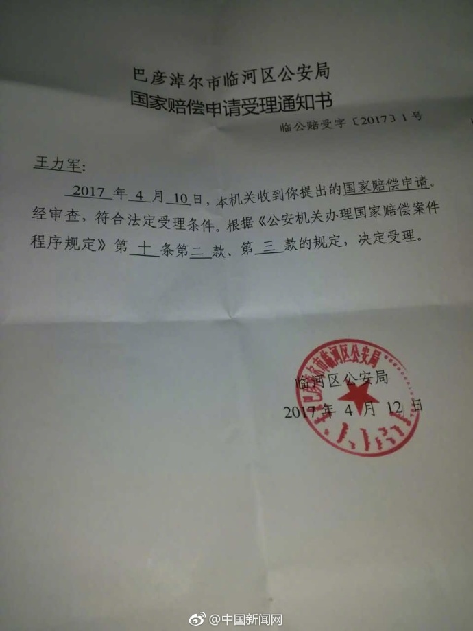 中新網北京4月12日電(記者 張尼 呂春榮)記者12日獲悉,“農民收購玉米案”又有新進展,當事人王力軍此前申請38萬余元的國家賠償,目前,巴彥淖爾市臨河區公安局已受理該申請。