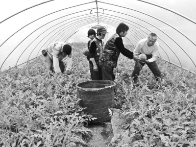 5月7日,在浙江省玉環縣干江鎮桔場村的瓜園里,瓜農柳福青正在棚里采摘西瓜。摘下來的西瓜集中到畦溝中的大籮筐里,然后,通過便道上的簡易鐵軌,輕輕松松地推向地頭。停在地頭的箱式貨車等著收貨。兩天前這輛大貨車在此收了近5000公斤特小蘭西瓜,今天計劃要收6500公斤,而柳福青家一戶就有5000多公斤。