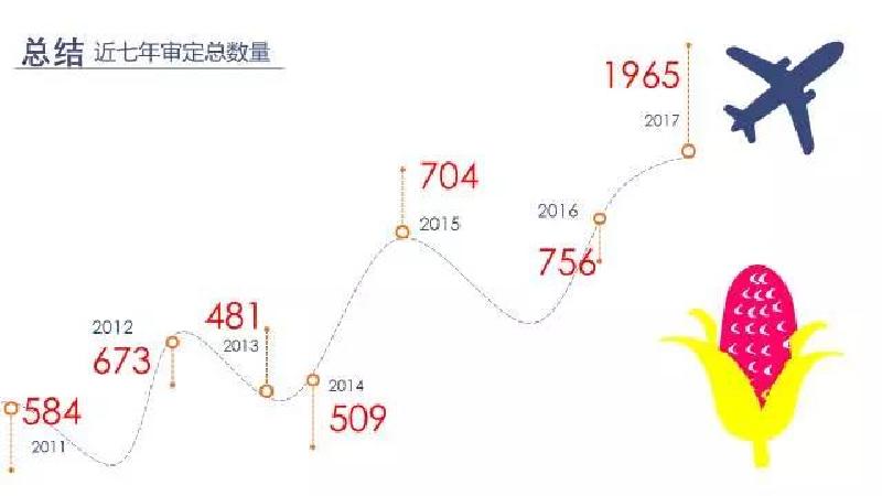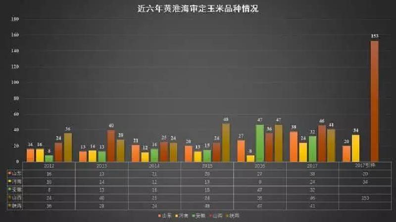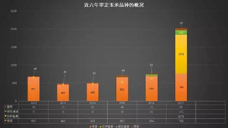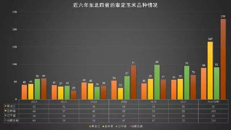 后記:從上圖可以看出玉米品種審定的數量,從 2015 年開始數量逐漸增加,2017 年數量比往年翻了 2 倍還多。2015 年以前品種審定的數量一直在波動式變化的。